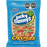 ESPECIFICACIONES: – Marca: Lucky Gummy´s – Cantidad: 1 kg – Forma: Aros de durazno – Ingredientes: Azúcares (azúcar), Grenetina, Glicerina, Ácido Cítrico, Ácido Láctico, Saborizantes y Colorantes artificiales, Dióxido de titanio.